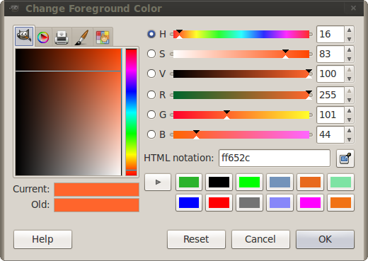 sammensat af rød = 255 (maximum), grøn = 101 og blå = 44. Dette giver da