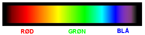For forenklingens skyld inddeles dette spektrum i tre dele som vist. Der er som sagt en forenkling, da overgangen naturligvis er glidende. De additive grundfarverDe tre dele rød, grøn og blå (RGB) kaldes også for de "additive grundfarver". Udgangspunktet her er sort (ingen lys), og man kan så lægge lys farvet i de tre additive grundfarver på, så man ender med hvidt - svarende til fuld styrke på både R, G og B projektørerne.