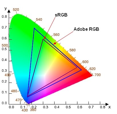Ovenstående figur illustrerer opbygningen af et farvebillede efter henholdsvis den additive og den subtraktive metode metode. Additiv billedopbygning: Det færdige billede (i midten) dannes med sort som udgangspunkt ved at addere et rødt, et grønt og et blåt delbillede. For hver addition bliver billedet lysere, hvorfor resultatet fremstår lysere end de enkelte RGB delbilleder. Subtraktiv billedopbygning: Det færdige billede (i midten) dannes med hvidt (f.eks. hvidt papir ved print) som udgangspunkt. Herefter bortfiltreres rødt i større eller mindre grad med cyan blæk eller tryksværte, grønt filtreres med magenta sværte, og endelig blåt med gul sværte. For hver bortfiltreret farve bliver billedet mørkere, hvorfor resultatet fremstår mørkere end de enkelte CMY delbilleder. I en ideelverden kan man altså ikke se forskel på billeder dannet op den ene eller på den anden måde. I realiteternes verden vil der dog være forskelle. Et papirbillede udsender jo ikke selv lys, og derfor har farvebalancen i det lys, hvorunder billedet betragtes, meget stor indflydelse på oplevelsen af billedets farver. Ved additiv billeddannelse på en skærm spiller dette en langt mindre rolle, idet skærmen jo selv udsender det lys, der danner billedet. Desuden vil papirbilledets farver ofte være 'forurenet' af reflekteret lys fra billedets overflade; d.v.s. lys der ikke passerer gennem tryksværten og derfor mindsker farvemætningen ved betragtning af billedet. Desuden har trykfarver eller blæk ikke helt den farverenhed, man i teorien arbejder med. Det betyder, at der yderlige tilsættes sort, så man i praksis arbejder med 4-farvetryk (CMYK). Som sagt arbejder en del fotoprintere med endnu flere farver. Princippet er dog som ovenfor beskrevet. FarverumVed at lade et stort antal personer med et farvemæssigt normalt syn betragte en farvepalette, kunne man fastlægge et farverum bestående af de farver som folk med gennemsnitssyn kunne se. Jeg tror, det var omtrent på denne måde det foregik. Man kan jo ikke sådan bare lige koble måleinstrumenter ind i hjernens billedbehandling for objektivt at måle, hvilke farver personen egentlig ser. Udtrykket farverum er egentlig noget malplaceret, idet dette rum som oftest gengives som en flad to-dimentional figur: ![]() CIELab Diagram. Figuren kan opfattes på den måde, at man har 'bøjet' spektret sammen i en næsten hesteskoformet bue (tallene langs denne kurve er bølgelængden i nm. Når der ikke er nogen tal langs den rette linie, der forbinder det røde område med det blå, så skyldes det, at farverne her (magenta og violette) er additive blandinger af rød og blå - som i det 'udfoldede' spektrum ikke findes, da blå og rød ligger i hver sin ende af dette. For entydigt at kunne definere en farve, har man så indskrevet denne figur i et retvinklet kordinatsystem. Ethvert koordinatsæt (X,Y) fra (0,0) til (1,1) vil så entydigt angive en farve. Indelingerne her er helt arbitrære, formoder jeg, og er blot fastsat, så de kan rumme den farveflade, som kan ses af de fleste. Man kan så umiddelbart se, at vi er ganske gode til at se mange og ganske mættede grønne nuancer, hvorimod rød og især blåt ikke kan ses i samme omfang. Hvordan læses figuren? Hvordan skal denne figur egentlig tolkes? Det synes jeg ofte glemmes i (sø-)forklaringerne om farverum. I midten (ikke det geometriske centrum, men deromkring) ses et 'hvidt' punkt. Når 'hvidt' står i anførselstegn, så skyldes det, at hvid egentlig ikke kan defineres absolut. Vender vi tilbage til RGB systemet, så kan sort fastlægges absolut, idet der er der, hvor alle RGB komponenter har intensiteten 0. Hvid er punktet, hvor alle RGB komponenterne har maksimum intensitet; men hvad der er, melder historien jo ikke noget om. Det kunne være (1, 1, 1) eller (1000, 1000, 1000). Når jeg alligevel kalder det hvidt, så er det fordi det repræsenterer det punkt i figuren, hvor RGB værdierne er ens og hvor de alle har deres maksimum (det lyseste punkt). Bevæger man sig nu næsten stik 'øst' mod det røde, så vil de farvepunkter, man møder, blive mere og mere intenst røde. Teknisk set må der ske det, at indholdet af grønt og blåt minskes, og den røde andel øges. Ser man på spektret for de punkter, der gennemløbes, så vil den røde 'top' blive højere og smallere. Bevæger vi os meget langt ud af denne linie - f.eks. med kurs mod 650 nm, så vil denne bølgelængde (eller rettere den dertil svarende frekvens) være den eneste 'pind' i spektret. ![]() Svag rød - med stor andel af andre farver ![]() Intens rød - relativt mindre andel af andre farver Når det ikke er muligt at skelne en sådan "ægte rødt" fra røde nuancer med en lille andel blåt og grønt i, så kunne man forestille sig, at det skyldes den støj, der altid vil være i en sensor - hvad enten det er øjets nethinde eller sensoren i et digitalkamera. Da signal/støj forholdet ikke er uendeligt stort, vil hverken vi eller sensoren være i stand til at skelne ideelt rene farver fra nuancer, der er 'forurenet med en lille portion af de andre farver. Tilsvarende betragtninger kan laves vedrørende grønt, hvis vi bevæger os mod nordvest. Eller for blåt, hvis vi går mod sydvest i diagrammet. I det magenta / violette område mod syd-sydøst er det lidt anderledes, idet rødt og blåt ligger i hver sin ende af spektret og en additiv blanding mellem rød og blå (= magenta) ikke kan beskrives med kun en 'top' i frekvens domænet, men har to toppe i spektret. Det er også derfor, at der ingen bølgelænde angivelser er på den nederste skråt afskårne del af figuren. Gamut (endelig!)Nu er vi vel omsider nået dertil, at vi kan introducere begrebet 'gamut'. Spørg mig ikke, hvordan det udtales! Gamut er et udtryk for det areal der i diagrammet XX indeholder mængden af farver, det udstyr, hvis gamut skal beskrives, kan gengive. Det kan være et TV, en computerskærm eller en printer.
