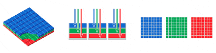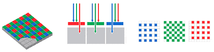 Det betyder, at det digitale billede skal behandles (fremkaldes kunne man sige), før det kan betragtes på skærm eller udskrives i al sin pragt. I de fleste kameraer er sensoren forsynet med et mosaik filter, hvorigennem eksponeringen foretages. Navnet mosaik filter hentyder til, at filteret består af uhyre små felter med vekselvis røde, grønne og blå felter, der hver især kun dækker en enkelt pixel eller photosite på sensoren. Det betyder så, at der skal flere pixels til (i teorien mindst 3) for at danne et enkelt farvet billedpunkt. Så den imponerende opløsning på sensoren, som man fører sig frem med i annoncerne, gælder faktisk kun, hvis man kunne fjerne mosaik filteret, og ta' sort/hvide billeder. ![]() Princippet i mosaikfilter teknikken Der findes sensorer, hvor de røde, grønne og blå følsomme photosites ligger som tre lag over hinanden, men af en eller anden grund har teknikken ikke vundet den store udbredelse. Om det skyldes patentrettigheder, eller ulemper af teknisk art, ved jeg ikke. ![]() Princippet i 3-lags teknikken (som dog endnu ikke rigtig har vundet inpas) Digitalisering - KontrastomfangDen tidligere omtalte analog til digital (A/D) konvertering kan i bedre kameraer foregå med mere end 8 bits nøjagtighed f.eks. 12 bit. Med 8 bit (= 8 binære cifre) kan man operere med op til 256 forskellige intensitets trin for hver grundfarve. Har man derimod 12 bits opløsning, svarer det til 4096 forskellige trin. Dette under forudsætning af, at A/D konverteringen kan finde sted med en liniaritet, der er bedre end ca. 0,25 o/oo - og der er faktisk ganske store krav. Et af problemerne er at få et tilstrækkeligt stort dynamik område. Mange kameraers eksponerings automatik er derfor indstillet til at eksponere mest efter højlysene, da 'udbrændte' - d.v.s. helt hvide partier i billedet tiltrækker sig opmærksomheden og får billedet til at se 'forkert' og overeksponeret ud. Det virker af en eller anden grund mindre 'forkert', hvis skyggerne er mørke - måske næsten helt sorte og uden detaljer. Jeg skal måske lige slå fast, at et større antal trin (flere bits opløsning) ikke i sig selv giver et større dynamik område. Men muligheden for at bevare selv små forskelle i toneværdi bliver større. I praksis betyder det, at flere detaljer i både skygger og højlys bedre bevares, så længe det faktisk dynamik område for den benyttede sensor ikke overskrides. Jamen - når nu billedet i langt de fleste tilfælde skal gengives på et medie (skærm eller papir), og når øjet som regel ikke kan skelne så fine nuancer på en toneskala, hvorfor så bekymre sig om mere end de 256 intensitets trin? Hvis vi vender tilbage til eksemplet med et motiv (de dunkle træer i forgrundens skovbryn med Møens solbeskinnede, hvide kridtklinter i baggrunden) med et så stort dynamikområde, at eksponeringen bliver et kompromis, så vil muligheden for efterfølgende at 'strække' toneskalaen f.eks. i skyggerne, og derved få detaljer frem her, være til stede. Hvis kameraet laver en reduktion fra 4096 trin til 256, så vil alle forskelle (næsten), der udgør mindre end 16 trin på toneskalaen jo smelte sammen til en enstonet flade - og detaljerne vil være tabt. Dette afhænger jo i høj grad af den overførings funktion eller "sværtningskurve", der er indbygget i kameraets konverterings program. I nogle kameraer kan man vælge mellem flere sådanne kurver, eller endog indlægge sine egne. Men det vil føre for vidt at komme ind på her.